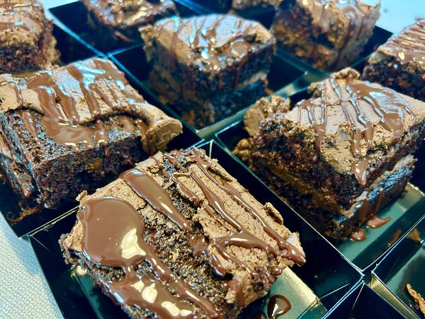Gooey fudge brownies filled with fudge chunks and topped with fudge ganache