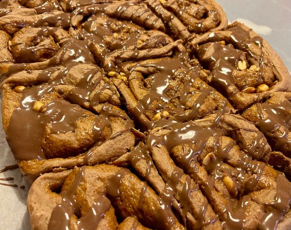 8 Jumbo chocolate buns loaded with cinnamon, chocolate, peanut butter, pretzels, sugar & spice rolled up tightly. Topped with Icing
